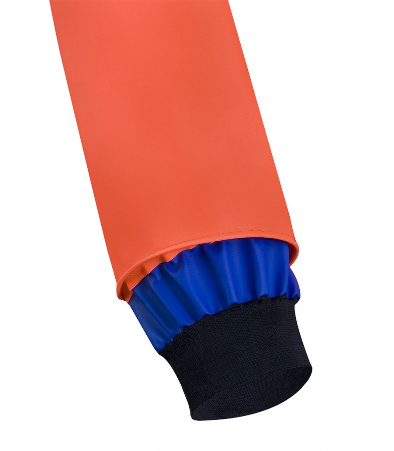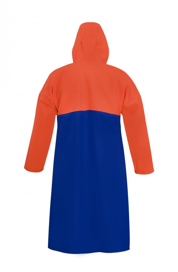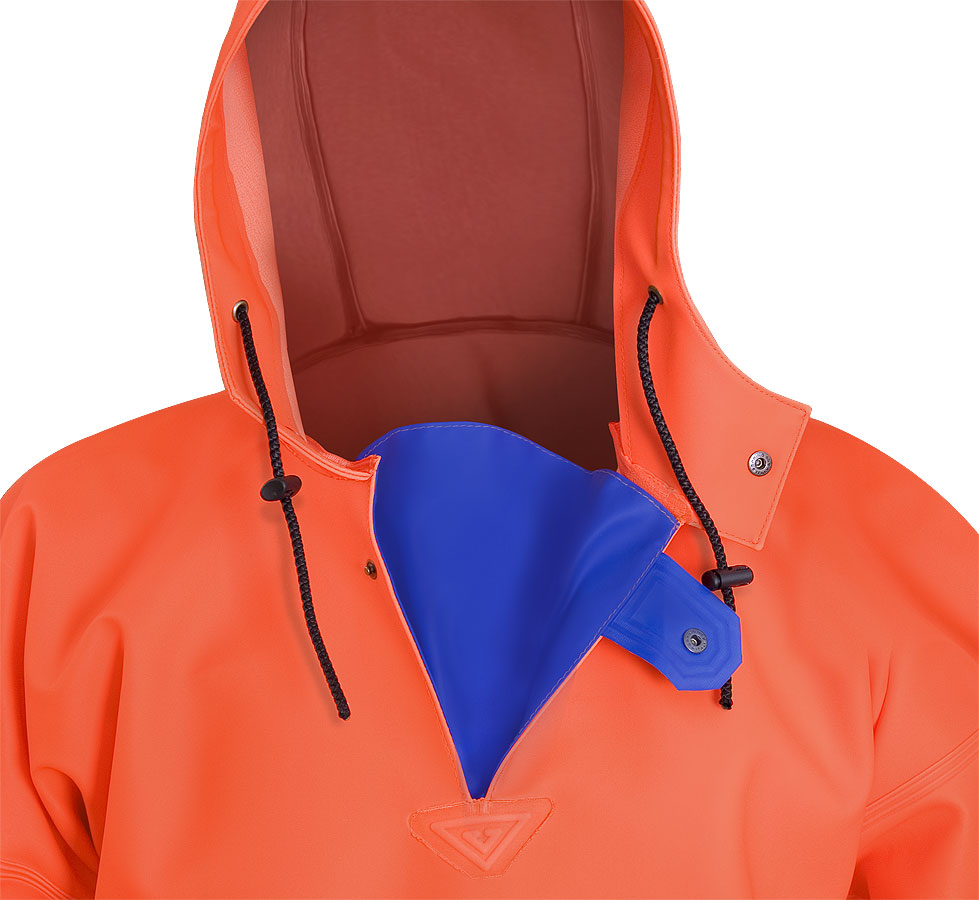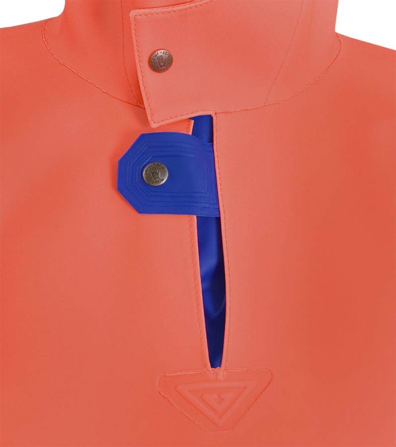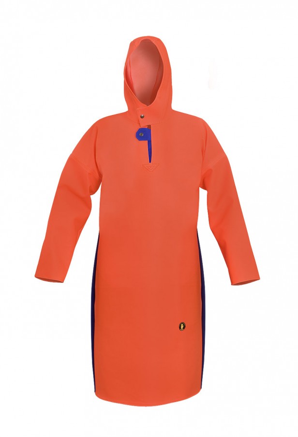 Die lange Bluse mit Kapuze und Windfängen in Ärmeln, über den Kopf angezogen, mit zwei Druckknöpfen am Hals. Dieses Modell wird aus zwei wasserdichten Stoffarten gefertigt: aus dem sehr robusten Plavitex Heavy Duty und aus dem saloppen Plavitex. Es kommt immer bei verschiedenen Fischarbeiten in schlechten Wetterbedingungen an der See zum Einsatz. Es gewährleistet einen wirksamen Schutz gegen Wind, Regen und Salzwasser. Die Technik des beidseitigen Pressschweißen erhöht wesentlich die Widerstandsfähigkeit der Nähte. Das Produkt erfüllt europäische Anforderungen der Norm EN ISO 13688, EN 343.