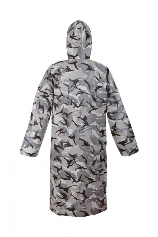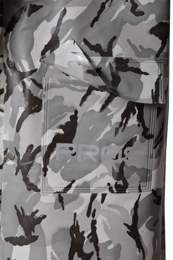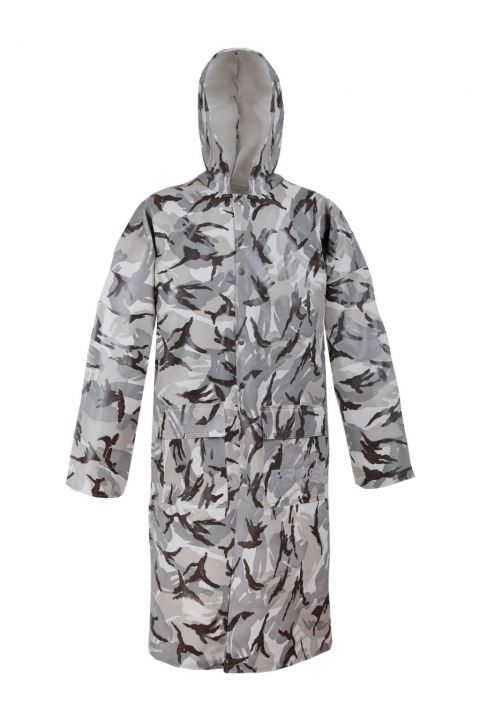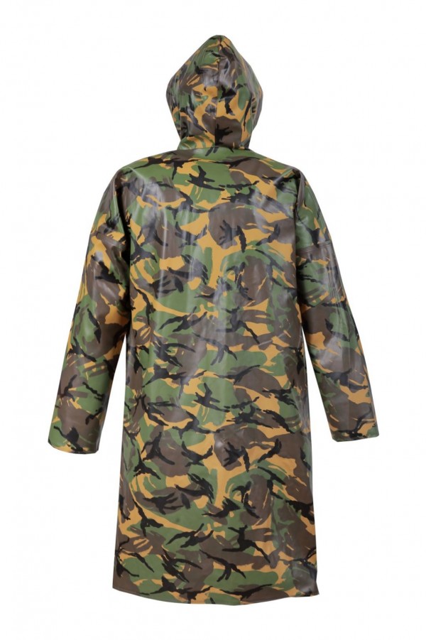 ‹Der Mantel in Tarnfarbe versichert eine hervorragende Tarnung. Mit Druckknöpfen, Kapuze und zwei Seitentaschen. Hergestellt aus dem wasserdichten Stoff Plavitex cotton, auf der Baumwolleunterlage. Dieses Modell kommt immer zum Einsatz bei schlechten Wetterbedingungen, bei der Jagd, beim Angeln und bei anderen Tätigkeiten unter freiem Himmel. Es gewährleistet den wirksamen Schutz gegen Wind und Regen. Die Technik des beidseitigen Presseschweißen erhöht die Widerstandsfähigkeit der Nähte.